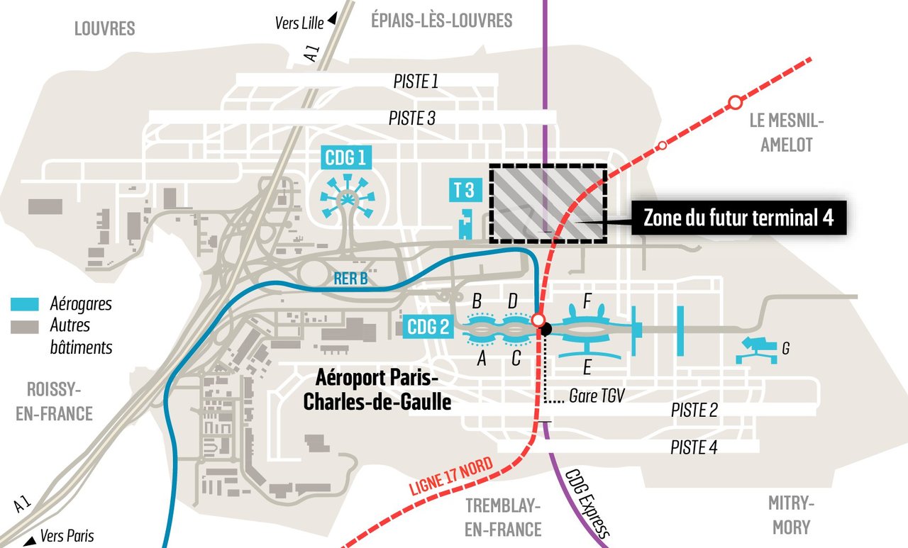 À cette échéance, il prévoit que l’aéroport de Roissy atteindra 75 M de passagers par an, contre 67 M actuellement. Ce nouveau terminal devrait être construit à partir de 2022 en plusieurs morceaux pour ne pas être surdimensionné au début de sa mise en service en 2025. Achevé, sa capacité atteindra les 30 M de passagers, soit la fréquentation actuelle d’Orly. Le terminal devrait se situer dans une zone au nord du terminal 2 F (voir infographie) et disposera d’une gare dédiée sur la future ligne 17 du métro automatique du Grand Paris.