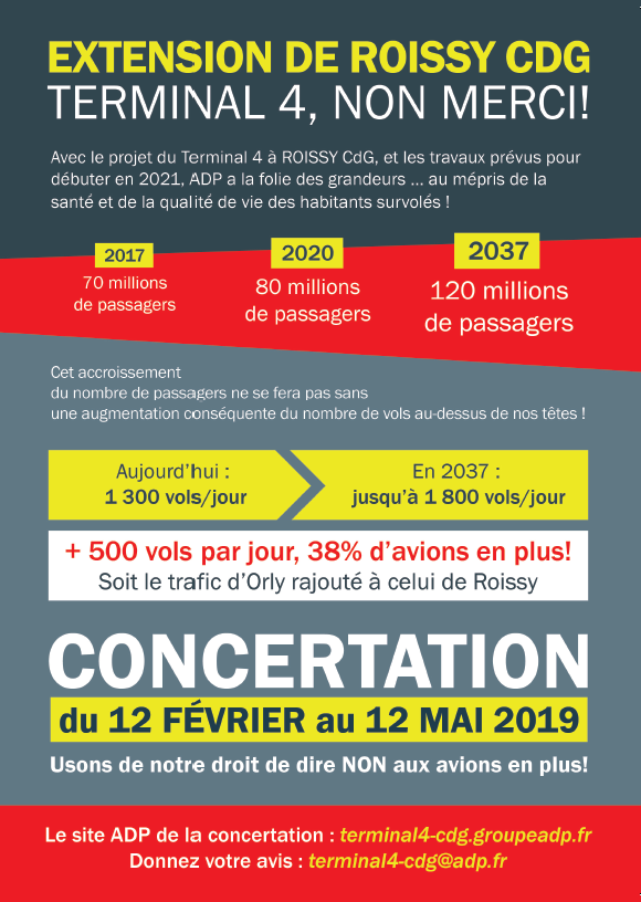Avec le Terminal 4 à Roissy-Charles de Gaulle, l’accueil de 40 millions de passagers supplémentaires à terme viendra augmenter considérablement les nuisances environnementales que vous subissez, impactant encore plus votre santé et votre qualité de vie, celle de vos enfants et petits-enfants :