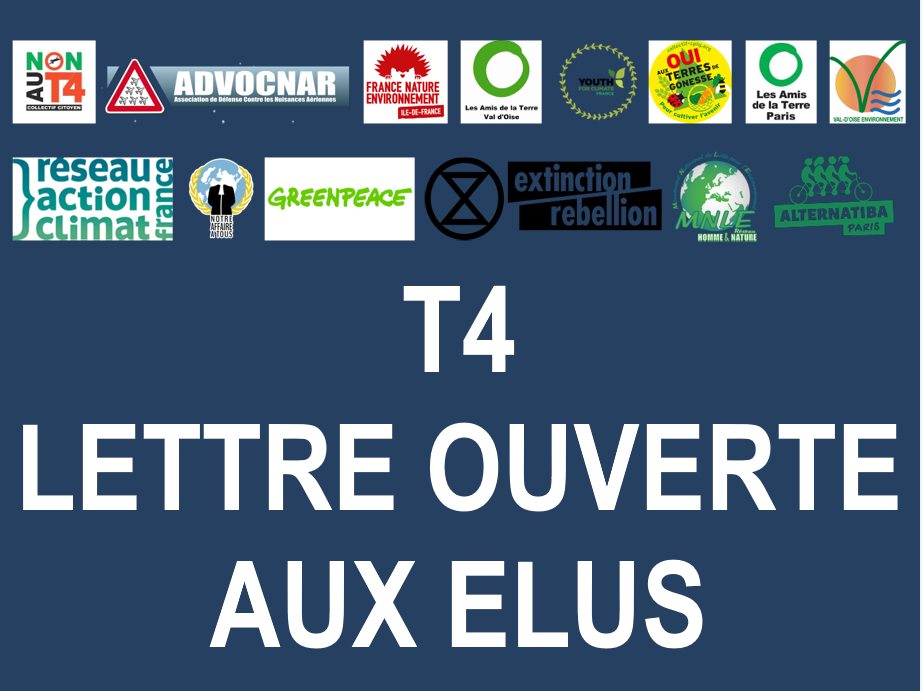 Signataires : collectif Non au T4, ADVOCNAR, France Nature Environnement IDF, Les Amis de la Terre Val-d’Oise, Val-d’Oise Environnement, Youth for Climate Val-d’Oise, CPTG, Extinction Rebellion Val-d’Oise, MNLE 93 et Nord-Est parisien, Alternatiba Paris, les Amis de la Terre Paris, MNLE, Notre Affaire à Tous, Greenpeace, Réseau Action Climat.
